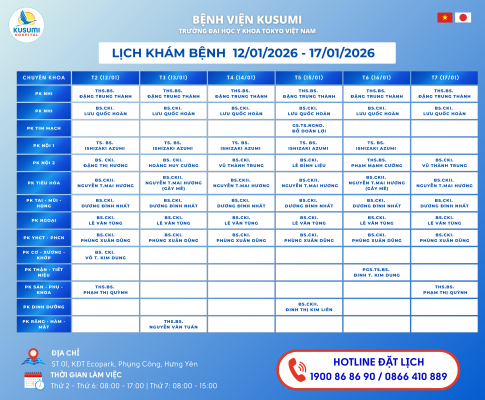 Bệnh viện KUSUMI – Bệnh viện Trường Đại học Y khoa Tokyo Việt Nam thông báo LỊCH KHÁM BỆNH từ ngày 12/01/2026 đến ngày 17/01/2026 như dưới đây...