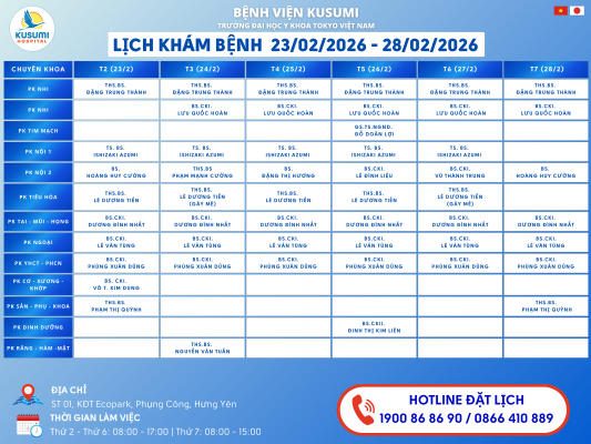Bệnh viện KUSUMI – Bệnh viện Trường Đại học Y khoa Tokyo Việt Nam thông báo LỊCH KHÁM BỆNH từ ngày 23/02/2026 đến ngày 28/02/2026 như dưới đây...