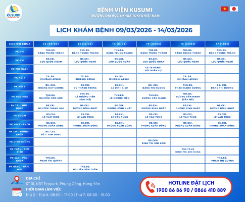 Bệnh viện KUSUMI – Bệnh viện Trường Đại học Y khoa Tokyo Việt Nam thông báo LỊCH KHÁM BỆNH từ ngày 09/03/2026 đến ngày 14/03/2026 như dưới đây...