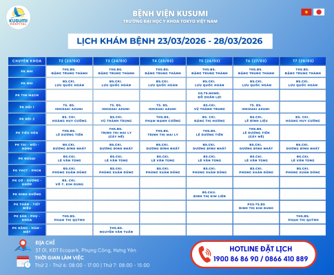 Bệnh viện KUSUMI – Bệnh viện Trường Đại học Y khoa Tokyo Việt Nam thông báo LỊCH KHÁM BỆNH từ ngày 23/03/2026 đến ngày 28/03/2026 như dưới đây...