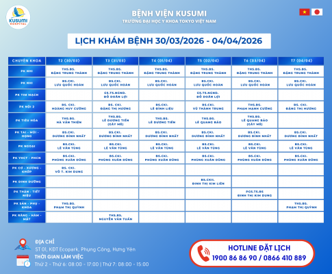 Bệnh viện KUSUMI – Bệnh viện Trường Đại học Y khoa Tokyo Việt Nam thông báo LỊCH KHÁM BỆNH từ ngày 30/03/2026 đến ngày 04/04/2026 như dưới đây...