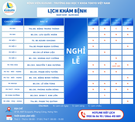 LỊCH KHÁM BỆNH từ ngày 01/09/2025 đến ngày 06/09/2025