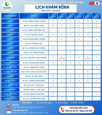 LỊCH KHÁM BỆNH từ ngày 29/09/2025 đến ngày 04/10/2025 như dưới đây