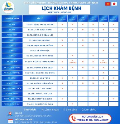LỊCH KHÁM BỆNH từ ngày 22/09/2025 đến ngày 27/09/2025