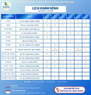 LỊCH KHÁM BỆNH từ ngày 08/09/2025 đến ngày 13/09/2025