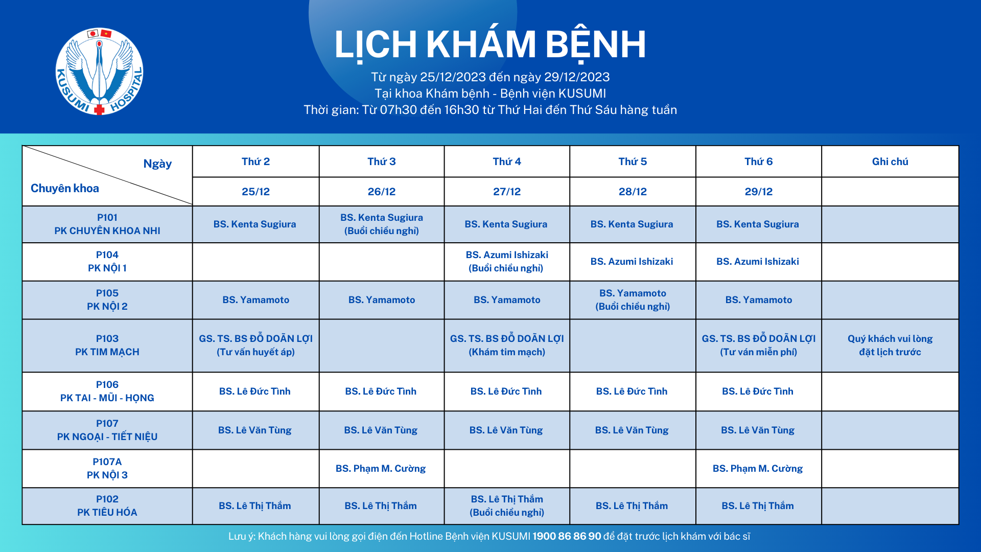Lịch khám bệnh tuần từ 25.12 đến 29.12.2023