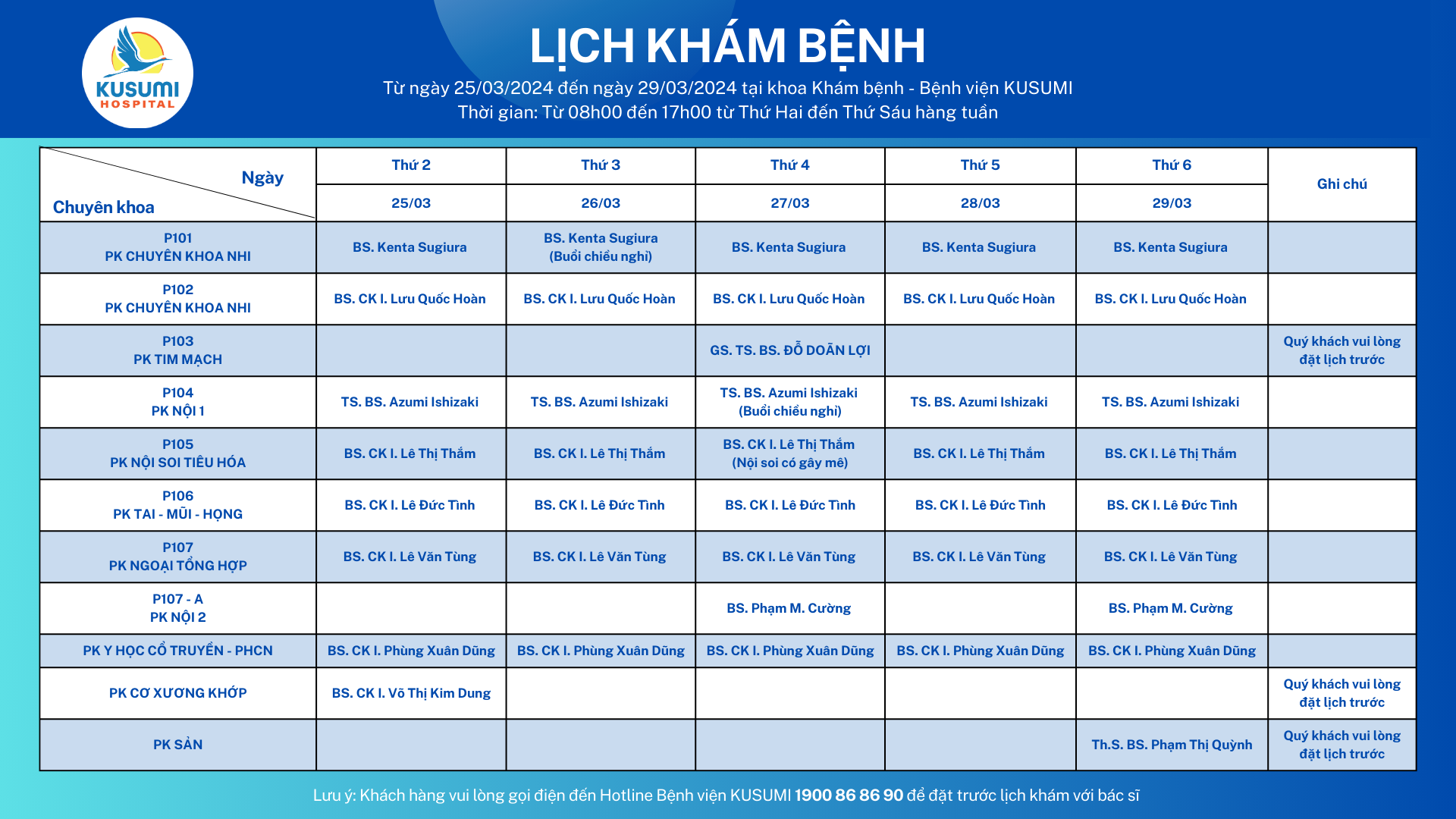 Lịch khám bệnh tuần từ 25/03 đến 29/03/2024