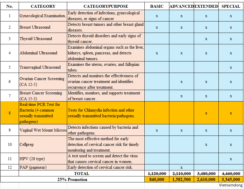 健診内容は診察、 乳腺超音波検査、甲状腺超音波検査、腹部超音波検査、経膣超音波検査、卵巣癌/乳癌腫瘍マーカー検査、クラミジアPCR検査、膣分泌物検査、子宮頸部細胞診/Papスメア、HPV(40種類)などになります。