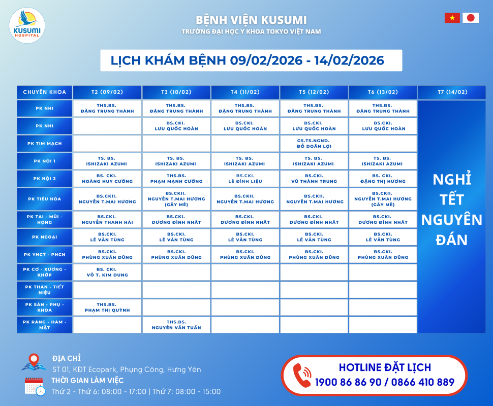 LỊCH KHÁM BỆNH từ ngày 09/02/2026 đến ngày 14/02/2026 như dưới đây