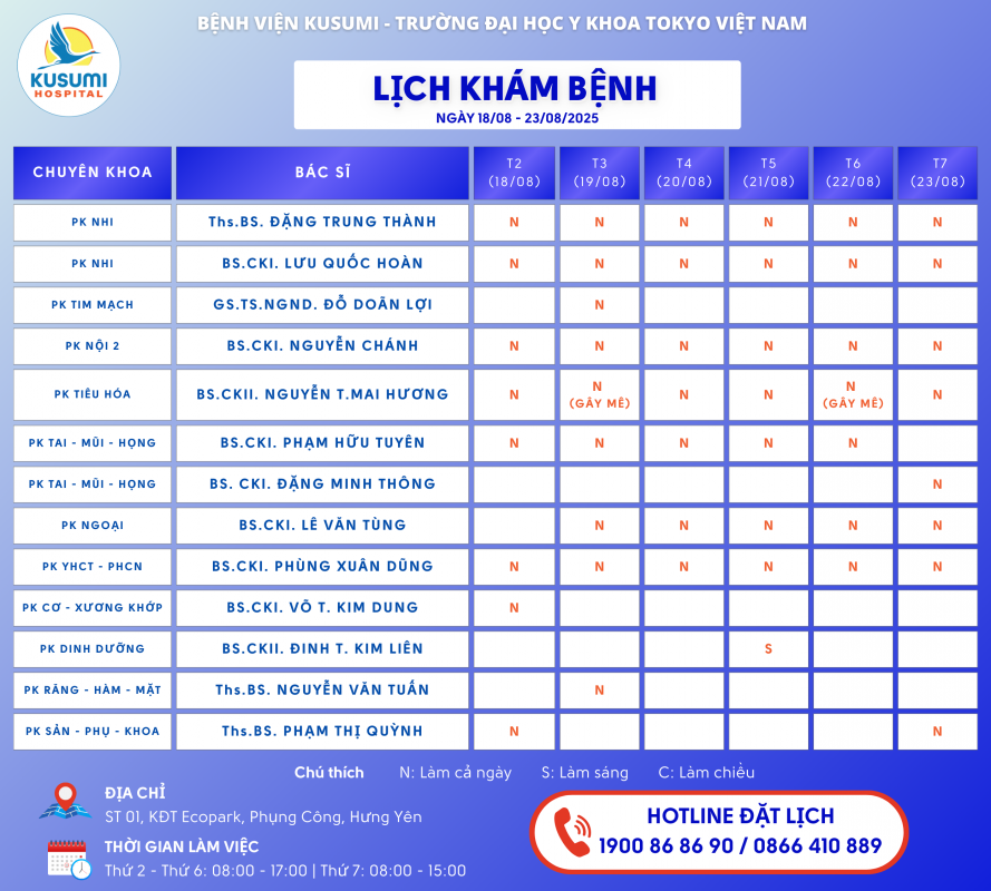 LỊCH KHÁM BỆNH từ ngày 18/08/2025 đến ngày 23/08/2025 Bệnh viện KUSUMI – Bệnh viện Trường Đại học Y khoa Tokyo Việt Nam thông báo LỊCH KHÁM BỆNH từ ngày 18/08/2025 đến ngày 23/08/2025 như dưới đây Khách hàng vui lòng liên hệ Hotline Bệnh viện để đặt lịch khám!