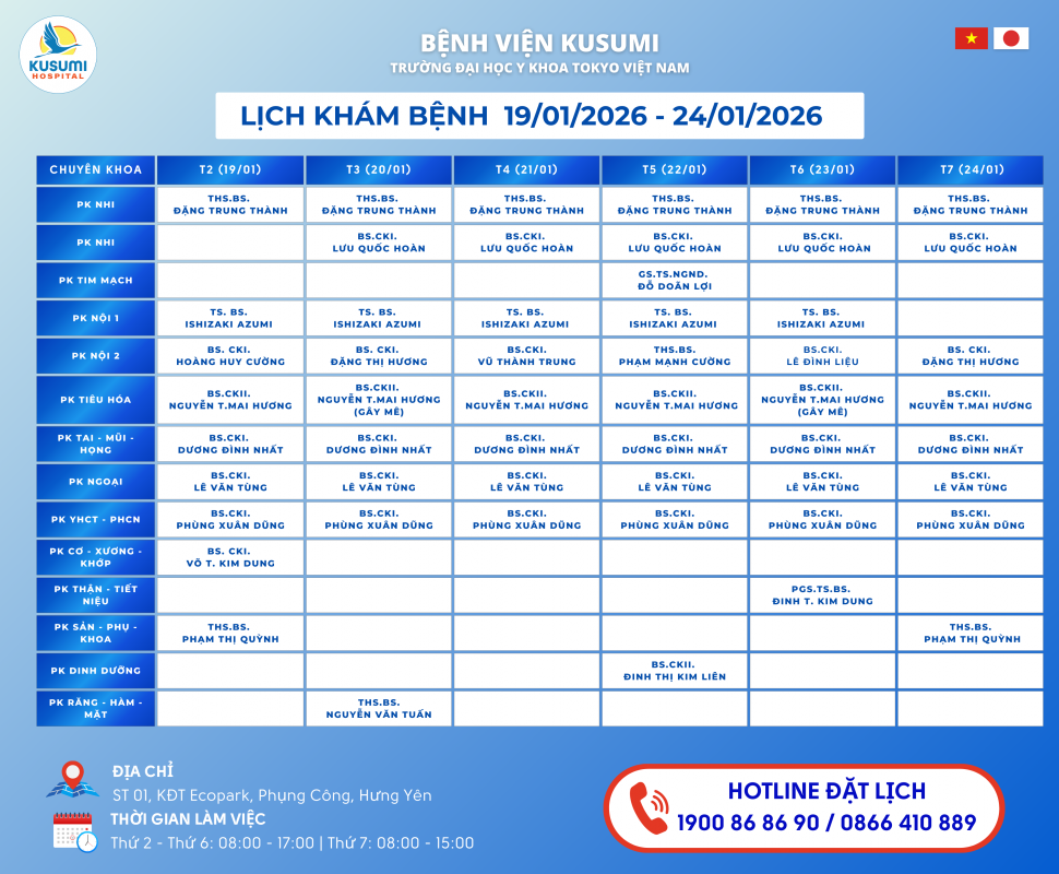 LỊCH KHÁM BỆNH từ ngày 19/01/2026 đến ngày 24/01/2026 như dưới đây