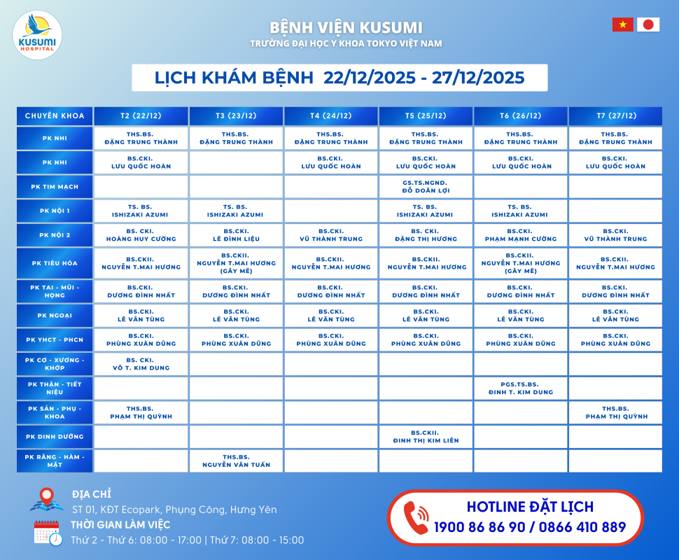 LỊCH KHÁM BỆNH từ ngày 22/12/2025 đến ngày 27/12/2025