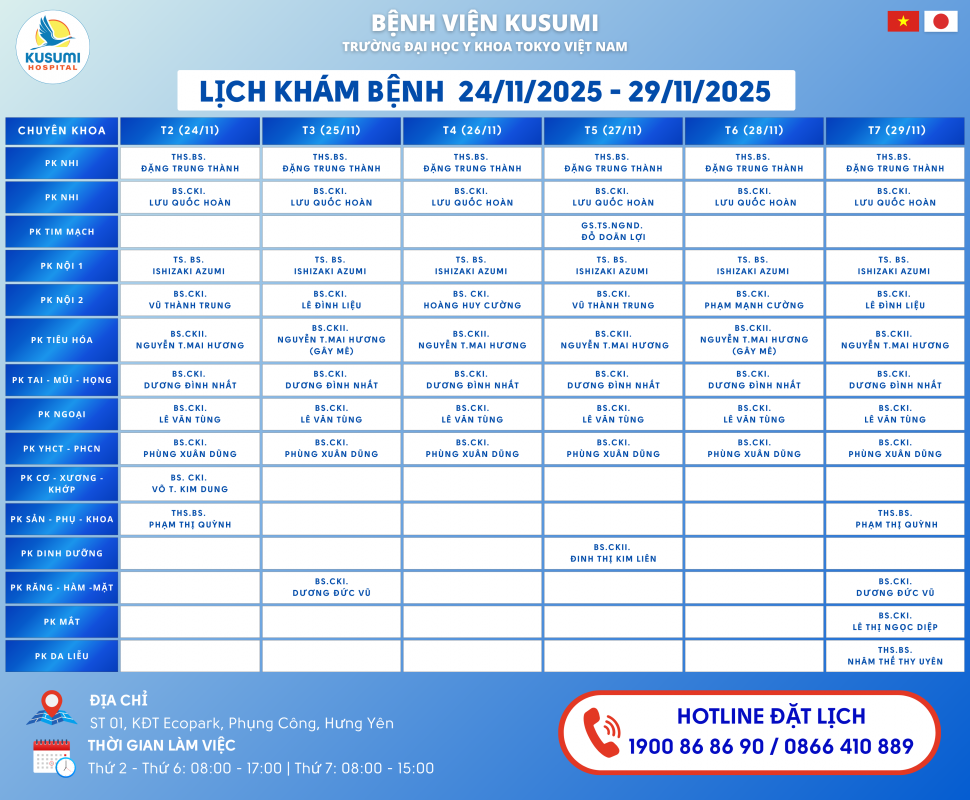 LỊCH KHÁM BỆNH từ ngày 24/11/2025 đến ngày 29/11/2025 như dưới đây