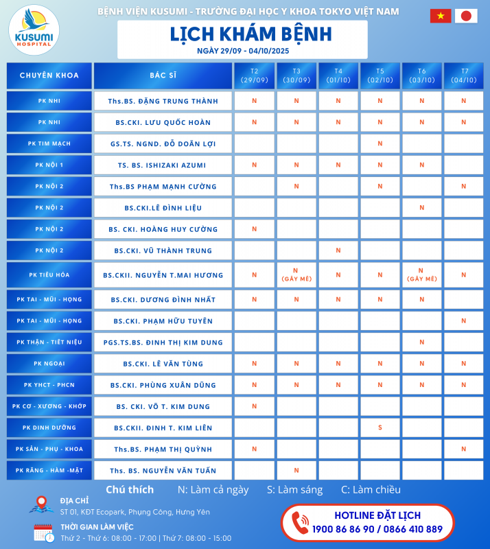 LỊCH KHÁM BỆNH từ ngày 29/09/2025 đến ngày 04/10/2025 như dưới đây Bệnh viện KUSUMI – Bệnh viện Trường Đại học Y khoa Tokyo Việt Nam thông báo LỊCH KHÁM BỆNH từ ngày 29/09/2025 đến ngày 04/10/2025 như dưới đây Khách hàng vui lòng liên hệ Hotline Bệnh viện để đặt lịch khám!