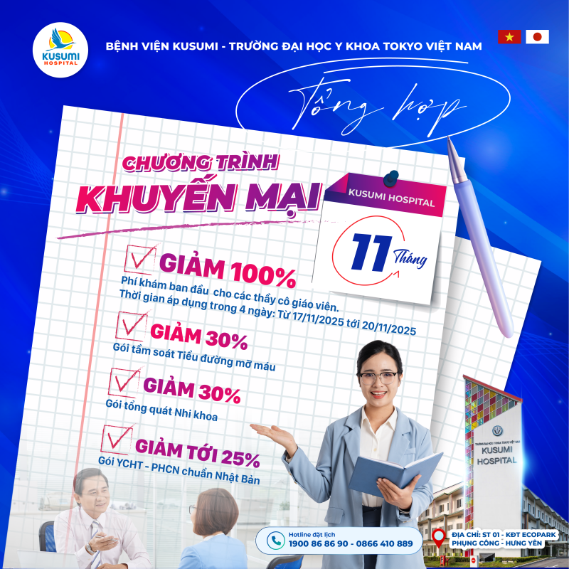 Với sứ mệnh mang đến dịch vụ y tế chuẩn Nhật Bản – chính xác – tận tâm, Kusumi hy vọng các chương trình ưu đãi trong tháng này sẽ giúp Quý khách hàng và gia đình có thêm cơ hội dự phòng, phát hiện sớm và chăm sóc sức khỏe toàn diện.